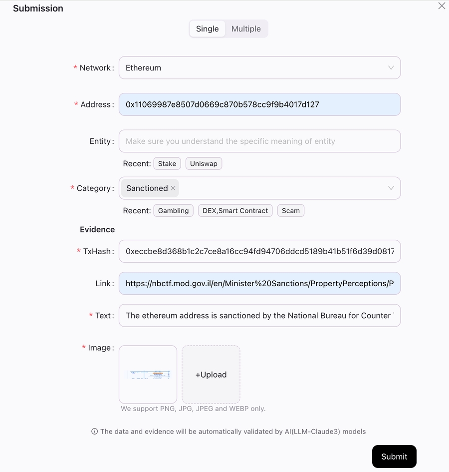 The Entity is not required because, in some scenarios, we know the Category but not the Entity. For example, if an address is stolen and we don't know by whom, we can mark the Category as Theft. The second part of the area is evidence information, which is considered to be very crucial. Only if the evidence can fully prove the correctness of the metadata, will the submission be valid, and you can get the corresponding incentives as follows: