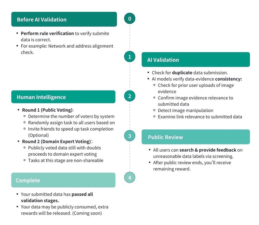 Human Intelligence: This stage is based on manual verification and is divided into two rounds, namely public voting and domain expert voting. Platform users participate in public voting, and domain experts from the platform and its partners participate in domain expert voting. The voting results will be finalized based on the Reputation-based Majority Voting mechanism.